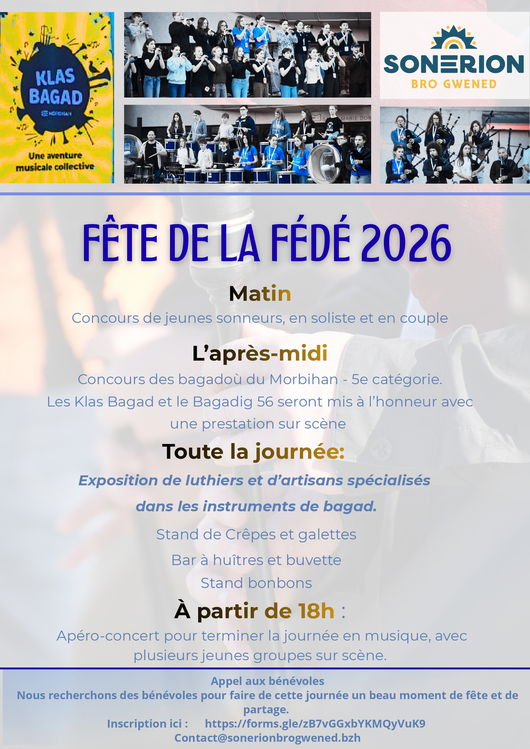 Fêtes, Festivals, Salons Fête de la Fédération de Sonerion Bro Gwened Accueil Agenda Fête de la Fédération de Sonerion Bro Gwened Fête de la Fédération de Sonerion Bro Gwened, le jeudi 14 mai. 14 mai Fête de la fédération Sonerion Bro GwenedJeudi 14 mai dans les jardins des remparts Jardin des remparts Pour aller plus loin Fêtes, Festivals, Salons 18 avr 19 avr Salon « C’est 100 % breton » Organisé par le groupe Actu, le salon « C’est 100 % breton » est un événement unique en Bretagne qui célèbre la richesse, la créativité et le savoir-f... Fêtes, Festivals, Salons 19 avr Tradi’Deiz Le dimanche 19 avril, Vannes accueillera la première épreuve du Championnat national de danse bretonne au Palais des arts. Infos pratiques Jardin des remparts Voir sur la carte Événement gratuit contact@sonerionbrogwened.bzh Sonerion Bro Gwened