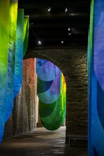 UNDA se propage dans le passage central. « Les pans colorés se succèdent dans l’espace tels des ondes transversales, rappelant que tout flux - lumineux, marin ou énergétique - traverse et relie les corps vivants », écrit l’artiste à propos de son installation. L’enchaînement des lés semble décomposer le spectre visible de la lumière, apportant de la matérialité à l’insaisissable. Le volume ainsi révélé, ou pour le moins l’illusion du volume, invite le visiteur à s’immerger dans l’œuvre, à l’éprouver, à faire l’expérience dans l’architecture de ce paysage monumental.