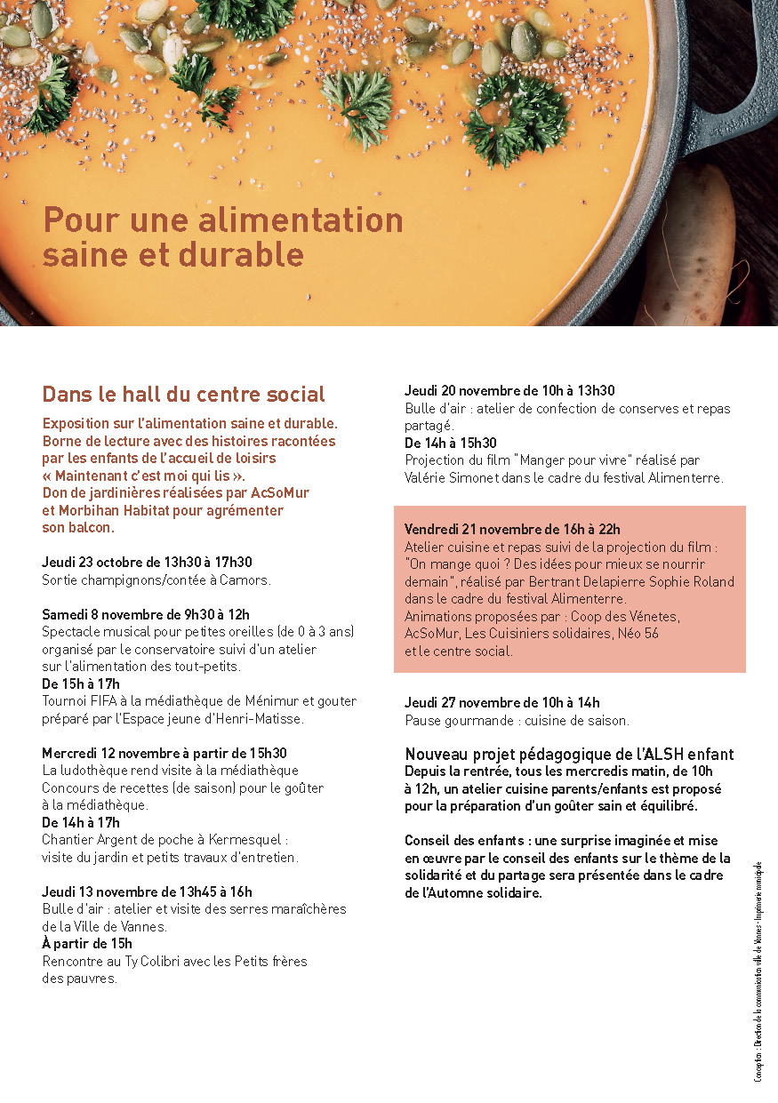 KELEIER PROGRAMM AN OBEREREZHIOÙ E-KREIZIG-KREIZ AR C’HARTER UR SKOAZELL DOC’H AN DEN Permanences du CCASKement kreizenn a zo zo ur lec’h beviñ plijadurus, evit bout an tostañ posupl doc’h Gwenediz ha roiñ he lod d’ar « beviñ gwell kevret ». Mesk-ha-mesk e vez aozet, doc’h ar lec’h, abadennoù àr dachenn an dudioù, an deskadurezh, ar sevenadur hag an arzoù. Lec’hioù int ma c’hell an den bout selaouet ivez, ha lec’hioù kenlodiñ digor da razh an dud.