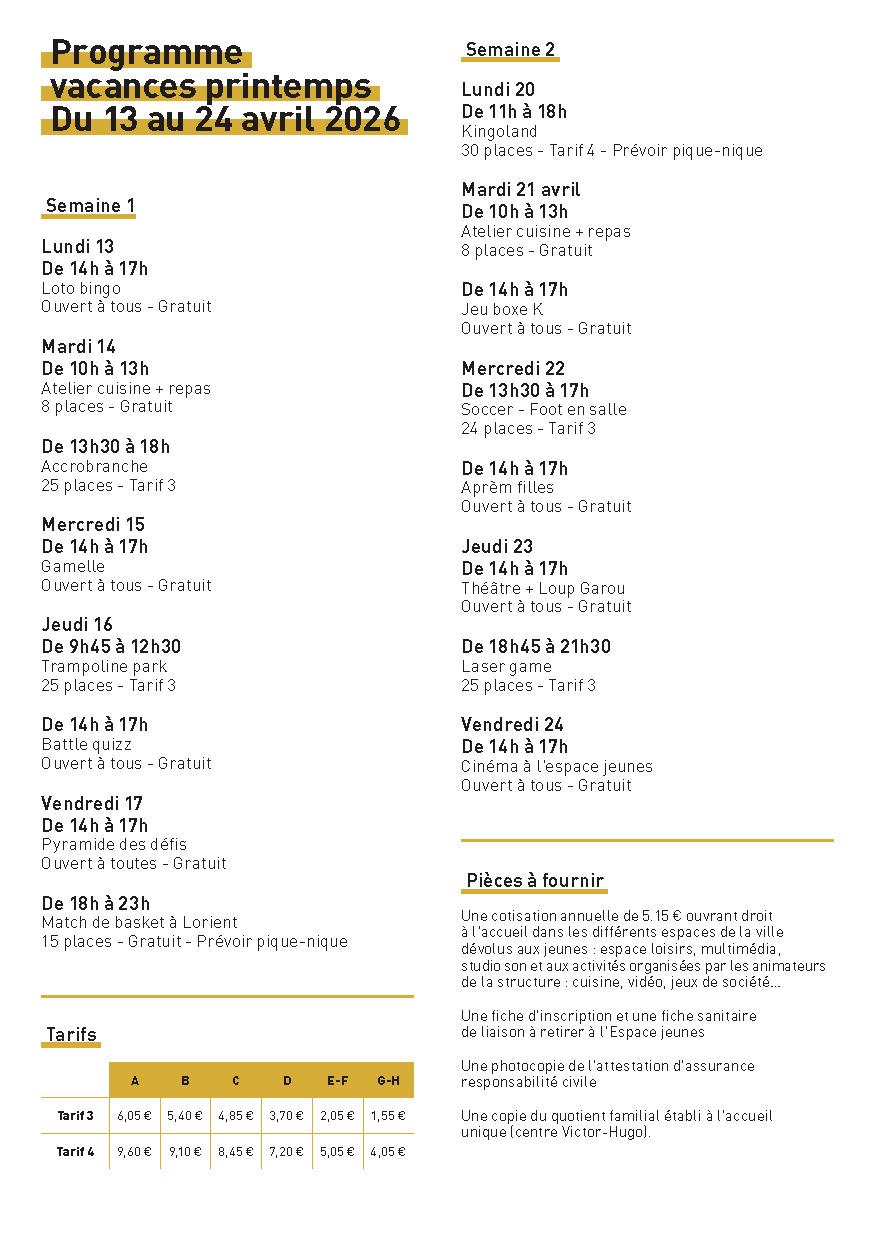 Kemerit lod e sortiadennoù, sportel pe sevenadurel, digor da razh ar rummadoù, pe en atalieroù evit kerent ha bugale 2-6 vlez. C’hwi a c’hell mont e vakañsoù ivez, da gampiñ d’an aod.