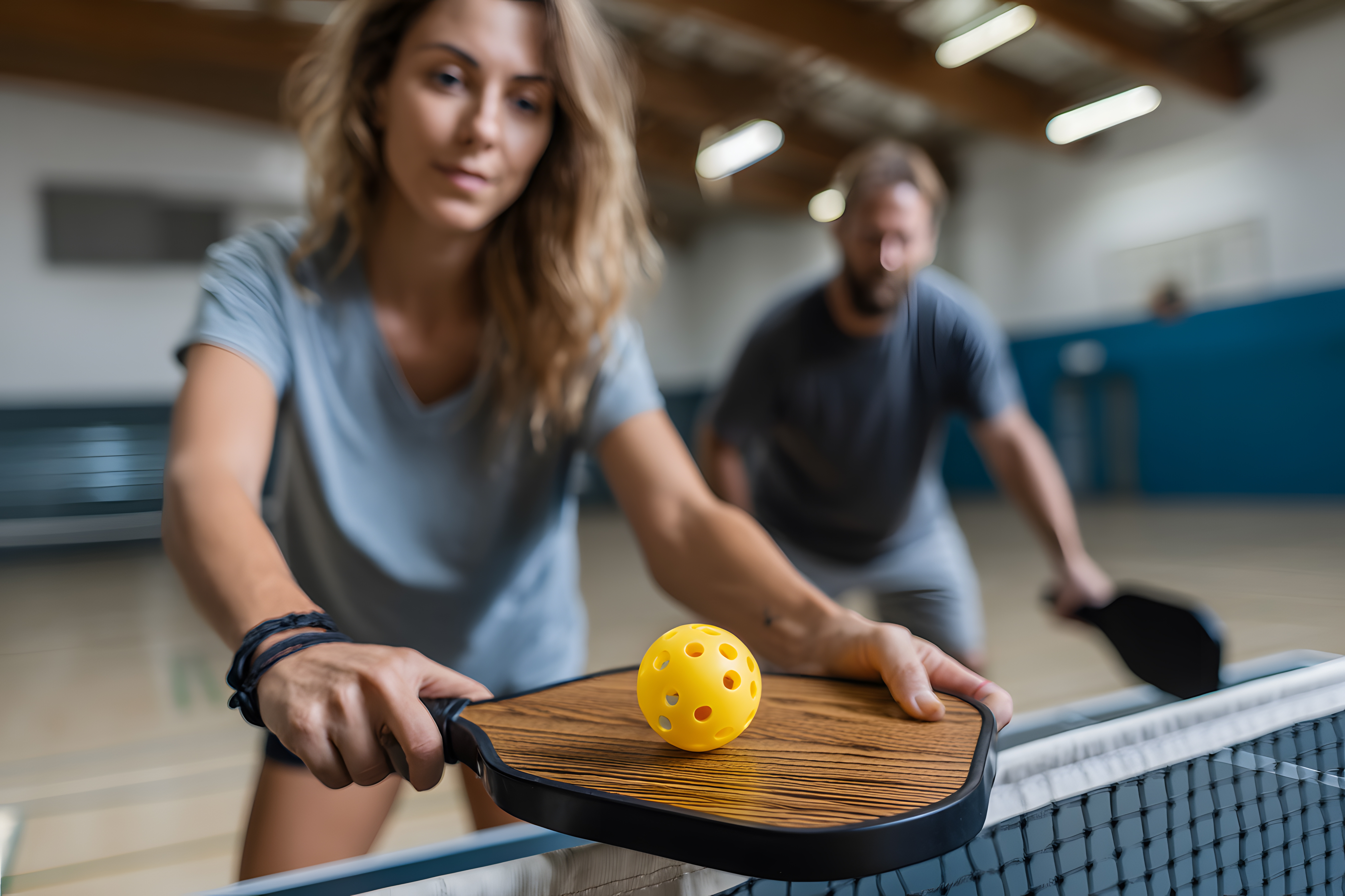 Un sport qui se joue avec une raquette pleine en composite et une balle en plastique perforée, sur un terrain de badminton. C'est un mélange de tennis, de badminton et de ping-pong