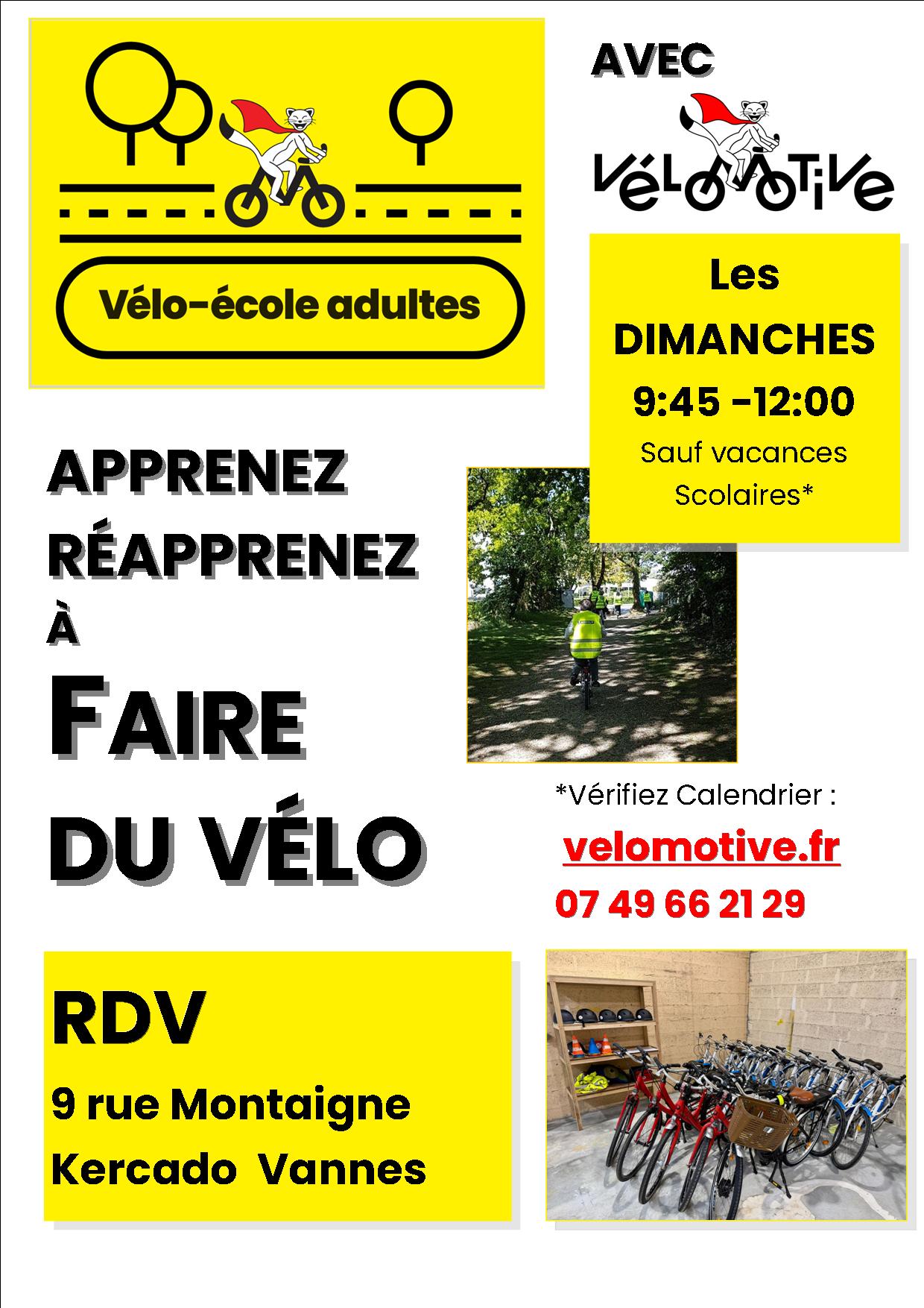 Une vélo école pour adultes, tous les dimanches hors vacances scolaires de 9h45 à 12h.