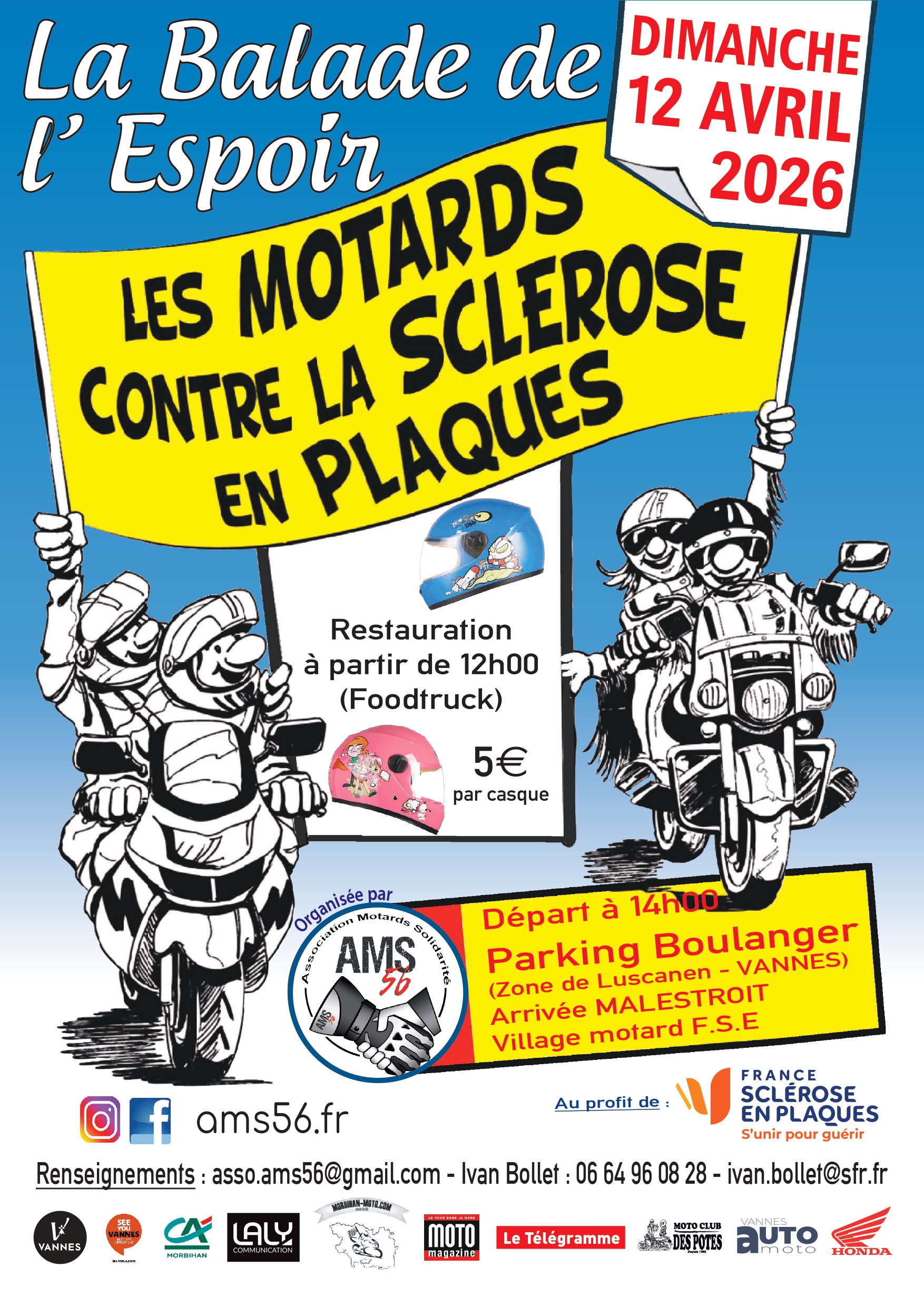 Balade Balade de l'Espoir d'AMS 56 Accueil Agenda Balade de l'Espoir d'AMS 56 Balade de l’espoir organisée par l’Association motards solidarité du Morbihan (AMS 56) au profit de la lutte contre la sclérose en plaques. 12 avr Balade de l'Espoir Départ parking Boulanger - Zone de Luscanen Infos pratiques Départ parking Boulanger - Zone de Luscanen Voir sur la carte 06 64 96 08 28 asso.ams56@gmail.com Départ à 14h