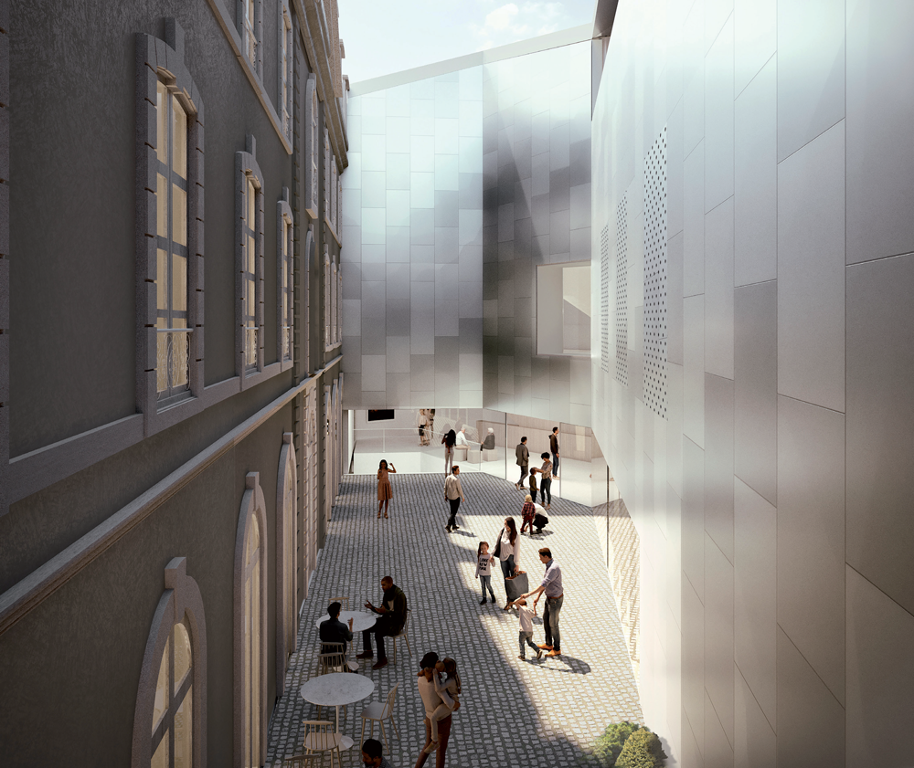 - Une extension transparente qui reflète la ville et dialogue avec les remparts.