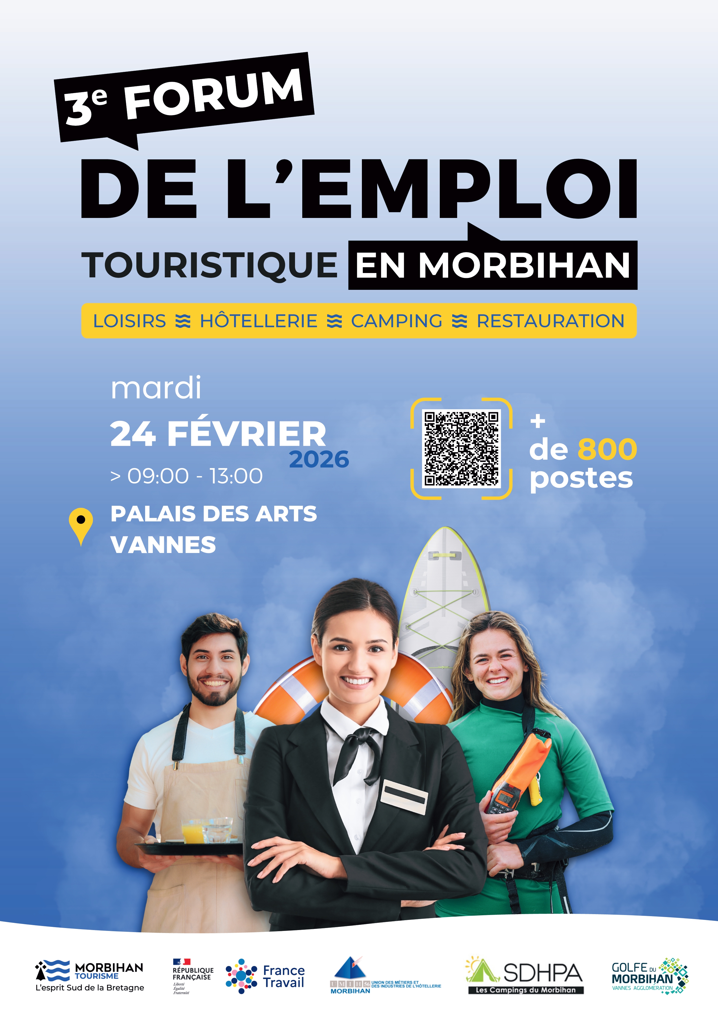 Co organisé par Morbihan Tourisme et France Travail avec le soutien de la SDHPA, l’UHMI, Vannes Golfe du Morbihan Agglomération, ce forum vise à rapprocher les entreprises touristiques en recherche de talents, des morbihannais actuellement en recherche d’emploi sur leur territoire.
