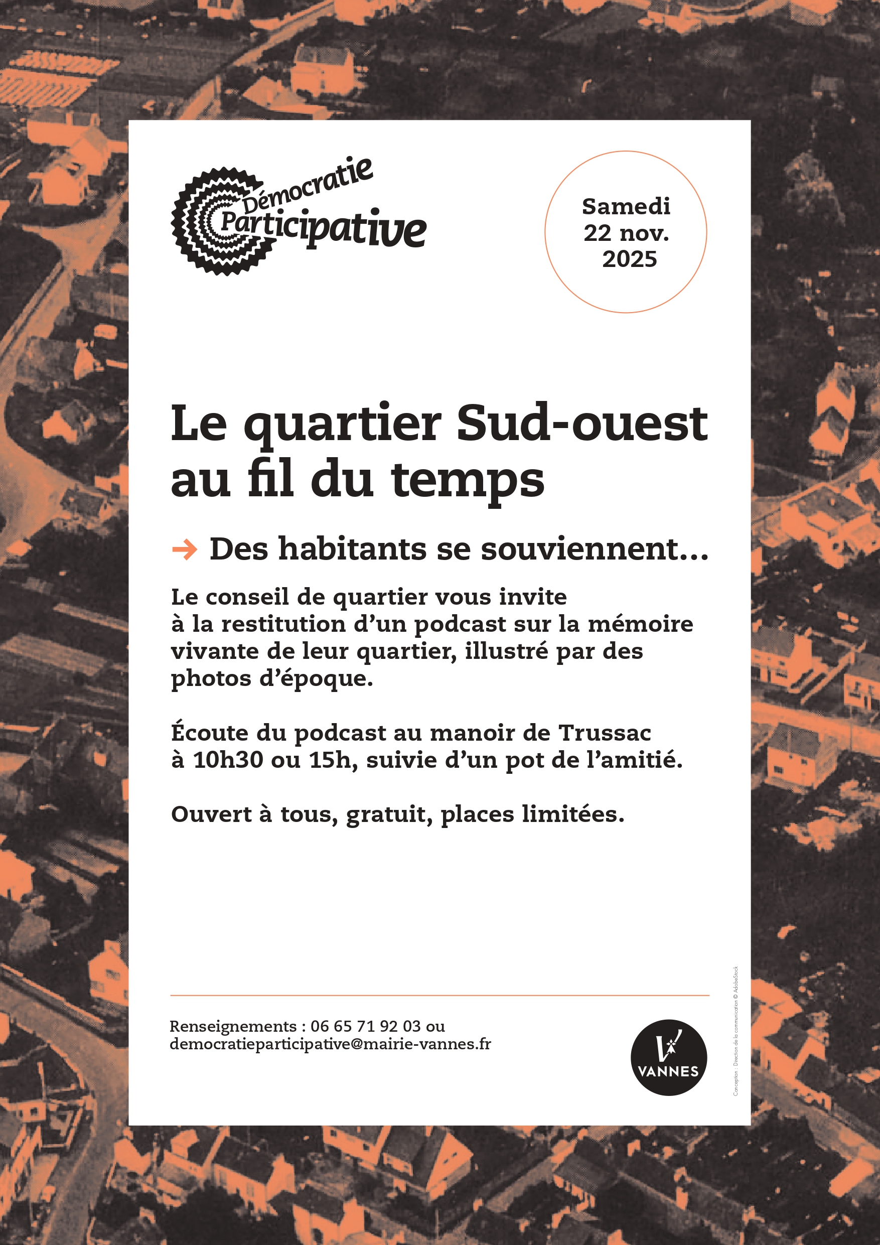 Patrimoine Le quartier sud-ouest au fil du temps Accueil Agenda Le quartier sud-ouest au fil du temps Le conseil de quartier sud-ouest vous invite à la restitution d’un podcast sur la mémoire vivante de leur quartier, illustré par des photos d’époque. 22 nov. Le quartier sud-ouest au fil du temps : des habitants se souviennentRendez-vous au manoir de Trussac - 60 rue Albert 1er Manoir de Trussac Pour aller plus loin Patrimoine 01 déc. 30 nov. Limur au quotidien | Un hôtel bien particulier L’hôtel de Limur se révèle dans ses moindres détails. Patrimoine 02 janv. 31 déc. Limur Le Centre d’Interprétation de l’Architecture et du Patrimoine (CIAP), accueille habitants et visiteurs de passage curieux de découvrir l’évolution urb... Infos pratiques Manoir de Trussac Voir sur la carte Événement gratuit 06 65 71 92 03 democratieparticipative@mairie-vannes.fr à 10 h 30 ou 15 h