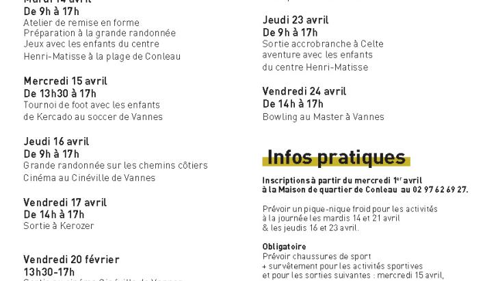 Kemerit lod e sortiadennoù, sportel pe sevenadurel, digor da razh ar rummadoù, pe en atalieroù evit kerent ha bugale 2-6 vlez. C’hwi a c’hell mont e vakañsoù ivez, da gampiñ d’an aod.