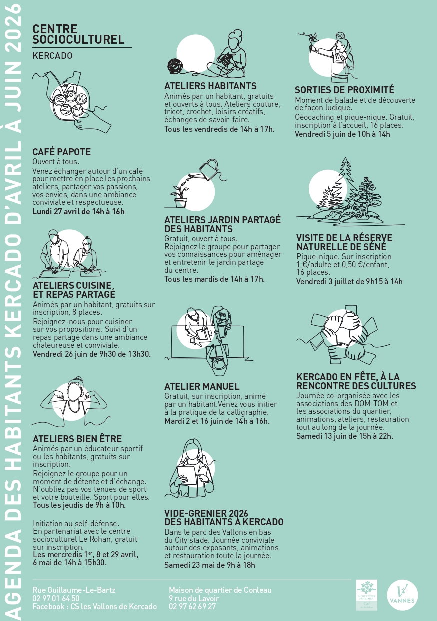 Activités ludiques Agenda des activités du centre socioculturel de Kercado Accueil Agenda Agenda des activités du centre socioculturel de Kercado Programme des activités proposés par le centre Socioculturel Les Vallons de Kercado. 02 mars 30 juin Programme des activités CS KERCADO agenda mars avril 2026.pdf CS KERCADO agenda avril-juin.pdf Evit monet pelloc'h geti Activités ludiques 01 sept. 30 juin Programme des activités des centres socioculturels Découvrez le programme 2025/2026 proposé par les centres socioculturels de la Ville de Vannes. Activités ludiques 01 oct. 30 avr Les dimanches en famille Le dimanche au musée, du 1er octobre au 30 avril, c’est gratuit ! Infos pratiques Centre Socioculturel Les Vallons de Kercado