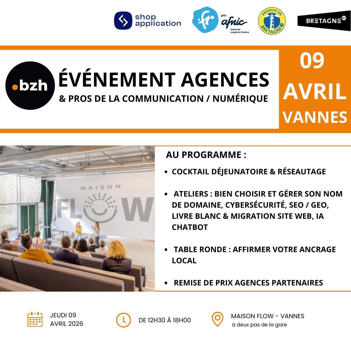 Conférences Événement agences .BZH Accueil Agenda Événement agences .BZH Professionnels de la communication et du numérique, rendez-vous à Vannes !L'extension internet .bzh vous donne rendez-vous le jeudi 9 avril à la Maison Flow pour un événement dédié aux enjeux actuels du numérique. 09 avr Événement agences .BZHJeudi 9 avril de 12h30 à 18hMaison Flow, 8 avenue Favrel et LincyInscription gratuite mais obligatoireInscription et programme complet iciPartenaires : Marque Bretagne, Produit en Bretagne, Shop Application et Afnic - Internet Made In France. Maison Flow Evit monet pelloc'h geti Conférences 19 mars Les mégalithes du golfe du Morbihan : un patrimoine exceptionnel revisité à l’aune des récentes découvertes L'UTA organise une conférence animée par Sandra Sicard. Conférences 20 mars Lee Miller et Dora Maar Conférence animée par Élodie Evezard, médiatrice-conférencière en histoire de l’art chargée de projet en médiation culturelle et proposée par l’Associ... Infos pratiques Maison Flow, 8 avenue Favrel et Lincy Voir sur la carte Événement gratuit