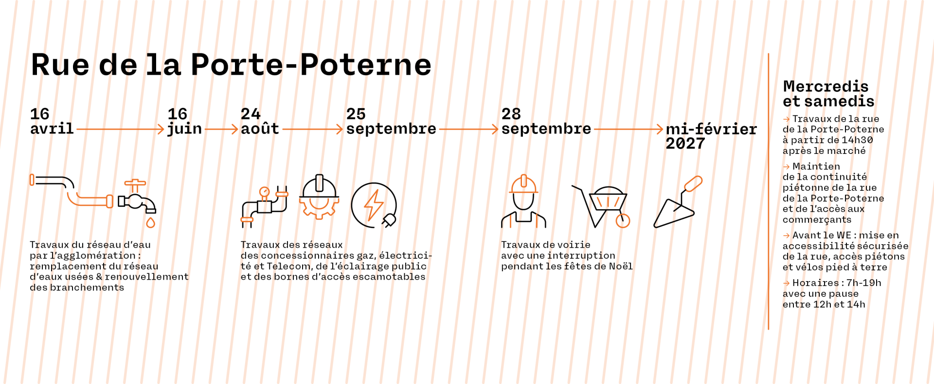 Pause estivale ! Le rythme du chantier sera réduit cet été et même mis en sommeil en août dans la rue de la Porte-Poterne, pour profiter des rues piétonnes, du marché, des halles des Lices et des commerçants de la rue de la Porte-Poterne et du cœur de ville.