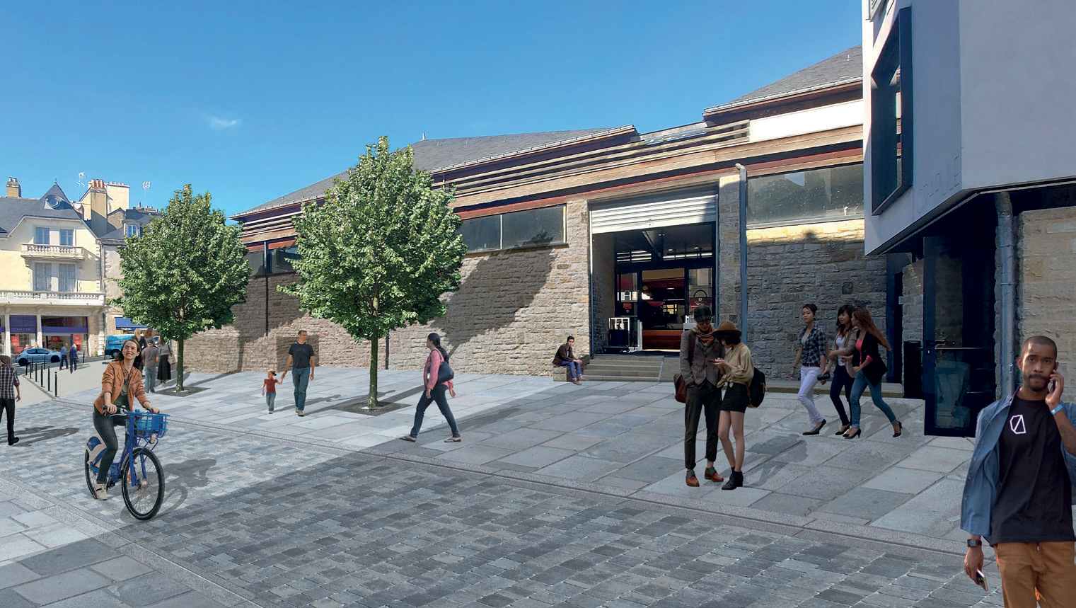 • Un revêtement en pavés de granit sous axe central circulable (250 m2) et des dalles de granit sous trottoirs et pour les terrasses (400 m2).
