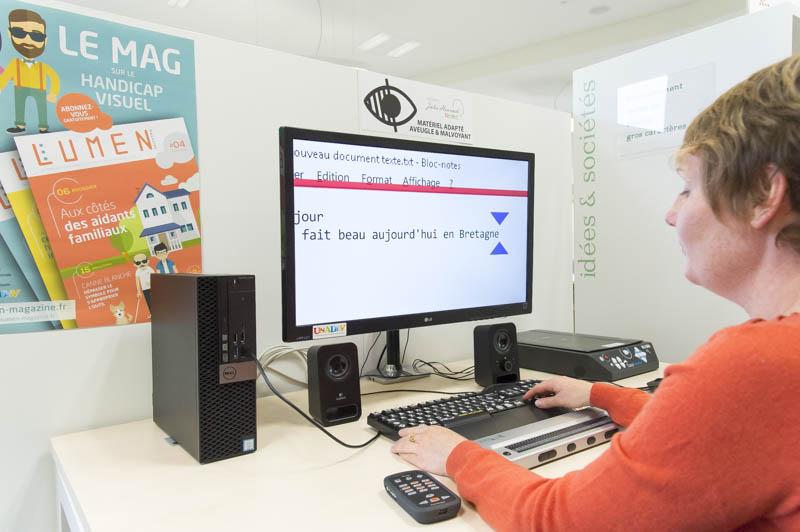 - Du matériel informatique adapté, constitué d’un poste de travail complet comprenant un ordinateur avec accès à Internet et clavier à grosses touches, des logiciels de synthèse vocale et d’agrandissement de caractères et un écran 27 pouces monté sur bras articulé. Un télé-agrandisseur, un afficheur braille, une loupe électronique, une machine à lire et deux lecteurs pour livres audio enregistrés sur CD, DVD ou en fichiers MP3.