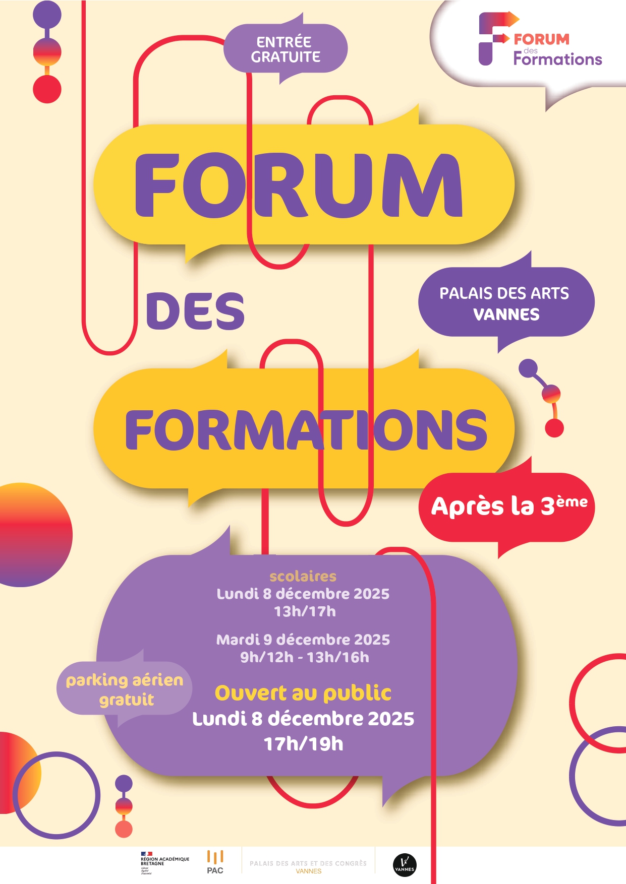 Éducation Forum des formations post 3ème Accueil Agenda Forum des formations post 3ème Le lundi 8 décembre au Palais des arts 08 déc. Forum des formations post 3èmeLundi 8 décembre de 17 h à 19 hPalais des arts, place de BretagneEntrée libre Palais des arts Pour aller plus loin Éducation 06 déc. Salon Studyrama des Lycéens et des Études Supérieures Le salon Studyrama des lycéens et des Études supérieures de Vannes vous donne rendez-vous au Chorus - Hall B, le samedi 6 décembre, pour préparer votr... Éducation 12 déc. Portes ouvertes IAE Bretagne Sud L’IAE Bretagne Sud, école universitaire de management de l’Université Bretagne Sud, organise sa soirée portes ouvertes le vendredi 12 décembre de 17 h... Infos pratiques Palais des arts Voir sur la carte Événement gratuit Événement accessible