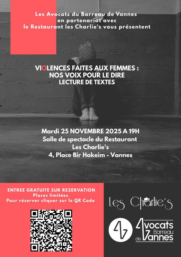 L’ordre des avocats de Vannes propose une soirée lecture sur les violences faites au femmes, en partenariat avec le restaurant les Charlie’s.