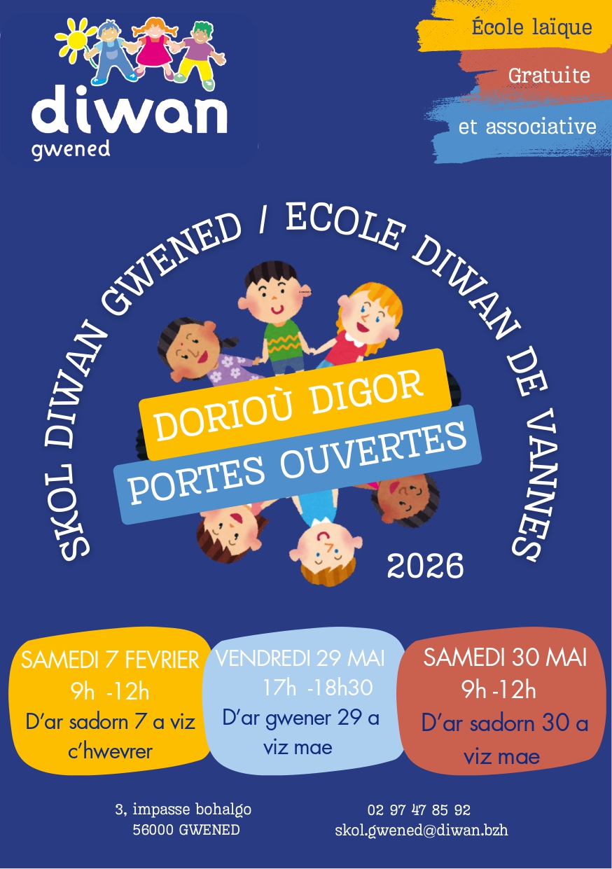 Éducation Portes ouvertes de l'école Diwan Accueil Agenda Portes ouvertes de l'école Diwan L'école Diwan, vous ouvre ses portes le samedi 7 février de 9h à 12h. 07 févr. Ecole Diwan, 3 impasse de Bohalgo Pour aller plus loin Éducation 16 janv. 17 janv. Salon Info’sup Bretagne Sud Le salon de l’Enseignement supérieur du Morbihan Éducation 24 janv. Portes ouvertes du collège Notre Dame le Ménimur Portes ouvertes du collège Notre Dame le Ménimur le samedi 24 janvier de 9 h 30 à 12 h. Infos pratiques Ecole Diwan Voir sur la carte Événement gratuit 02 97 47 85 92 skol.gwened@diwan.bzh Ecole Diwan De 9h à 12h