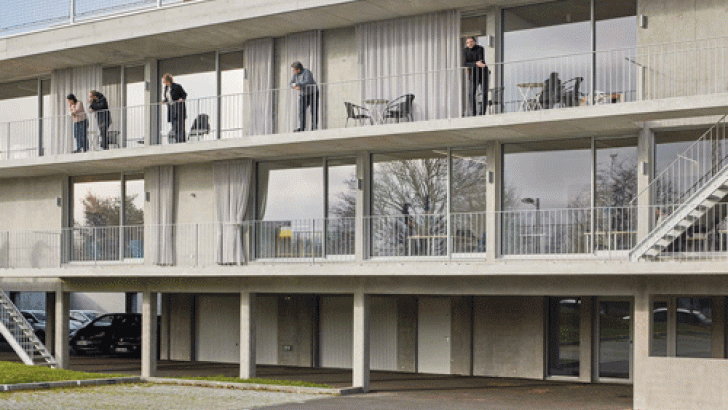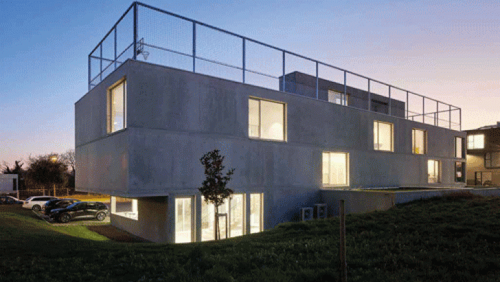 Les 8 places de stationnement en rez-de-chaussée sont recouvertes d’une toiture végétalisée. L’aménagement paysager d’ensemble contribue à la réussite architecturale de cette réalisation
