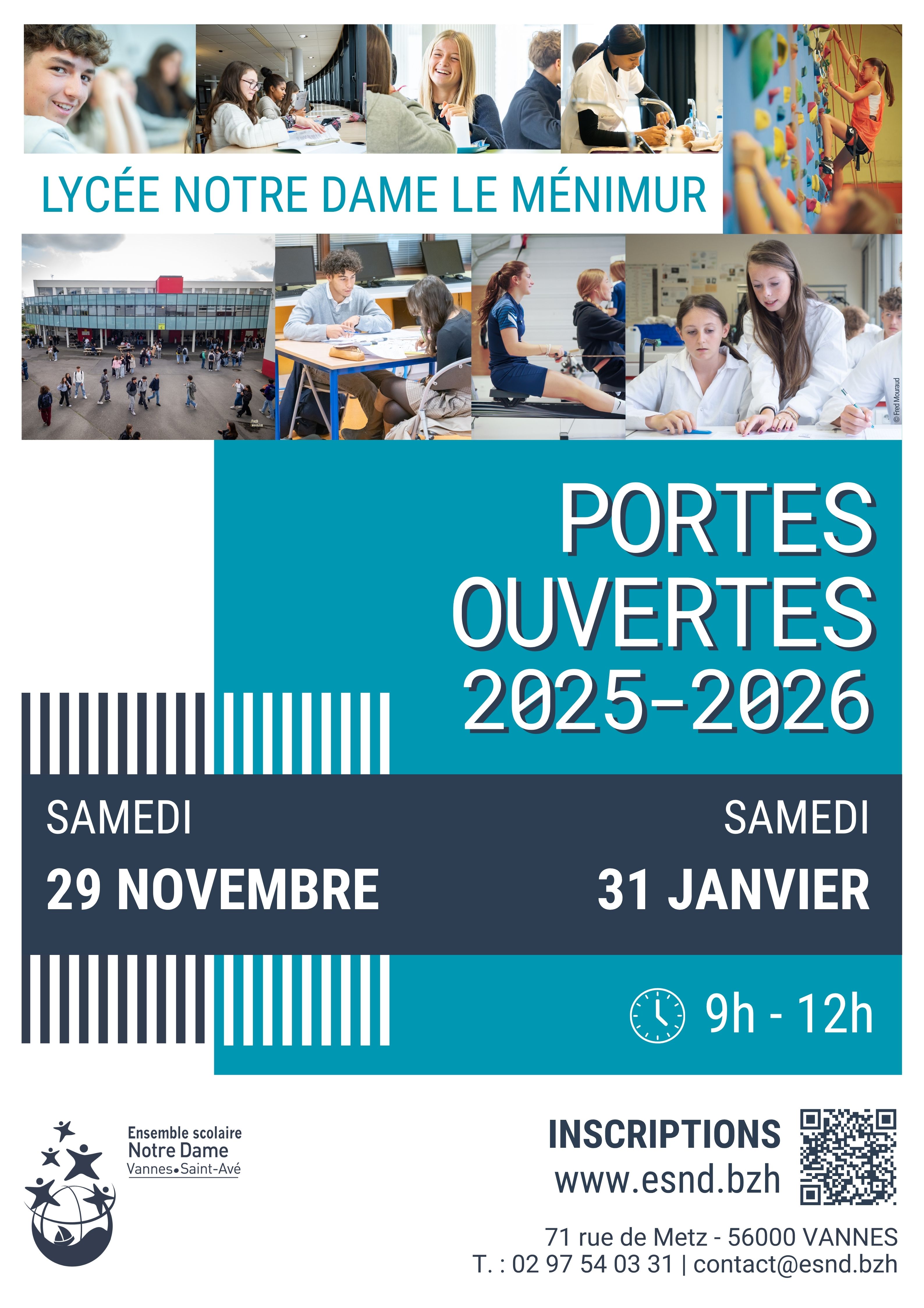 Éducation Portes ouvertes du lycée Notre Dame le Ménimur Accueil Agenda Portes ouvertes du lycée Notre Dame le Ménimur Portes ouvertes du lycée Notre Dame le Ménimur les samedis 29 novembre et 31 janvier de 9 h à 12 h. 29 nov. Portes ouvertesLes samedis 29 novembre et 31 janvier de 9 h à 12 h.Sur inscriptionsLycée Notre Dame le Ménimur, 71 rue de Metz 71 rue de Metz Pour aller plus loin Éducation 08 nov. Forum d’orientation des lycées Le samedi 8 novembre au Palais des arts. Infos pratiques 71 rue de Metz Voir sur la carte Événement gratuit Événement accessible 02 97 54 03 31 contact@esnd.bzh Notre Dame le Ménimur