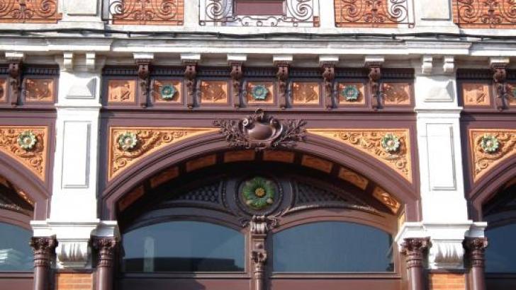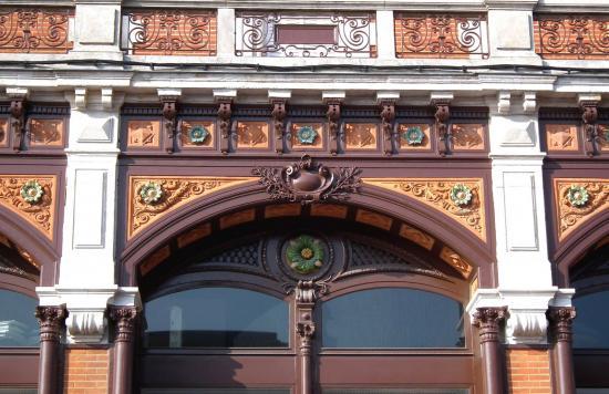 Le bâtiment frappe l’attention par son architecture éclectique et les multiples matériaux employés pour l’élévation et la décoration de sa façade.