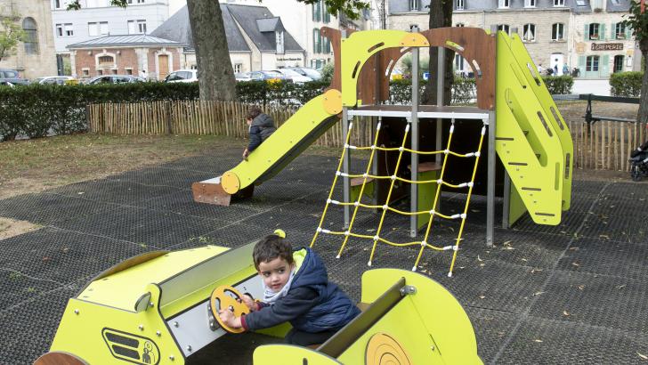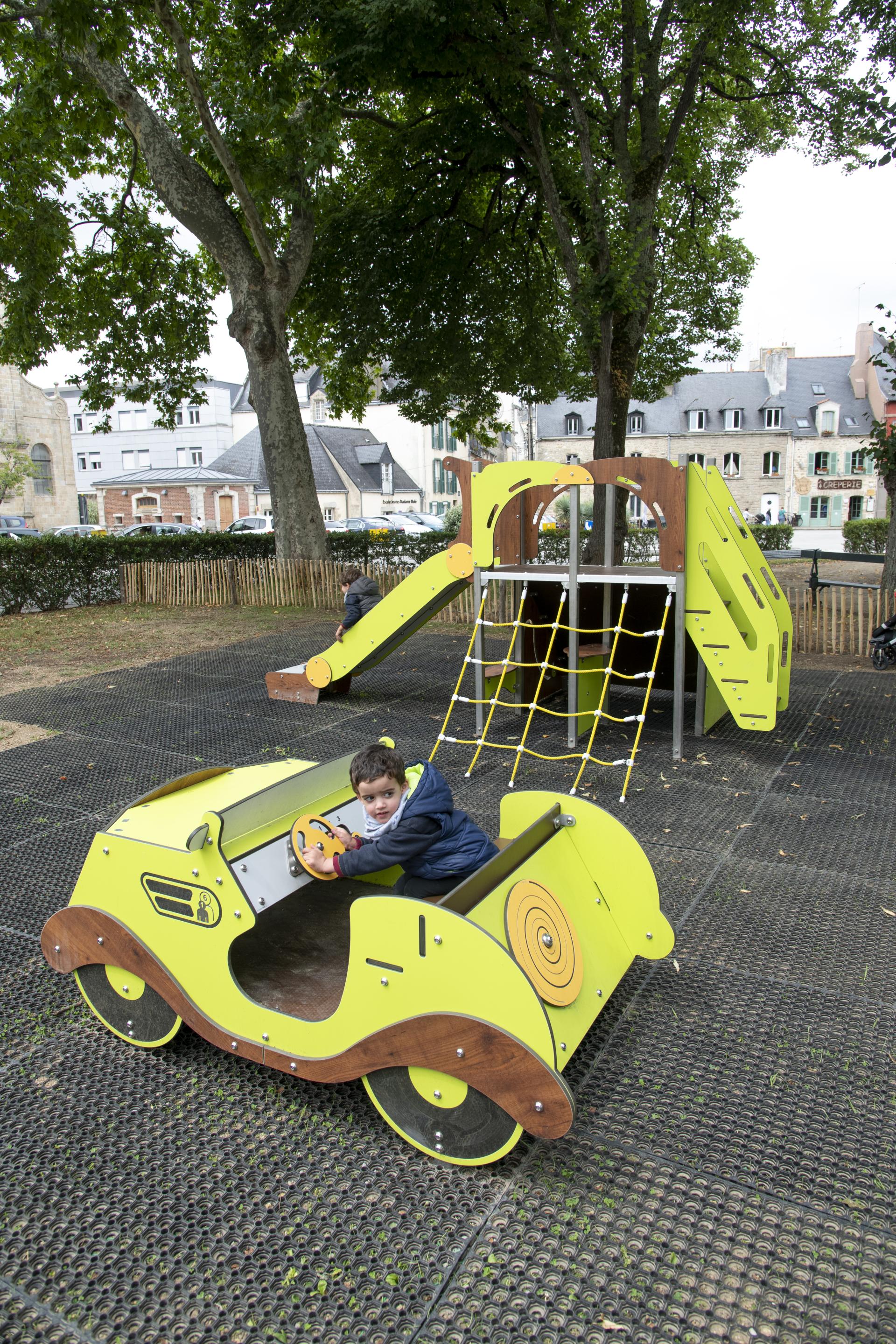 Le véhicule avec des panneaux verts s’harmonise avec la structure toboggan. Le véhicule en thème « nature » permet d’associer la Ville dans les jardins.